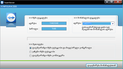 ეს არის Geo TeamViewer რომელითაც შეხვალთ სხვის კომპიუტერში! ოღონდ ვის კომპიუტერშიც შედიხართ ის თანახმა უნდა იყოს თორე ისე ვერ შეხვალთ იმიტო რო პროგრამის ადრესი ჭირდება რაც მთავარია ქართულადაა!